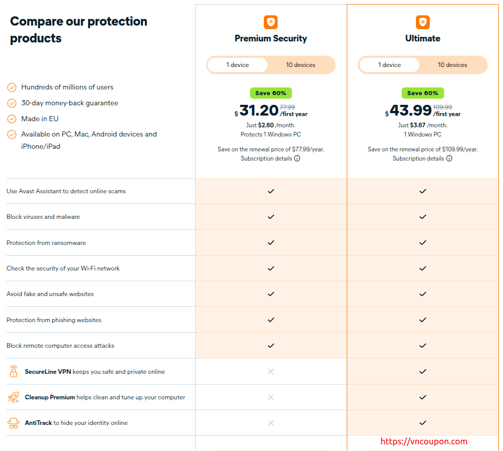 Compare Avast products: Premium Security vs Ultimate