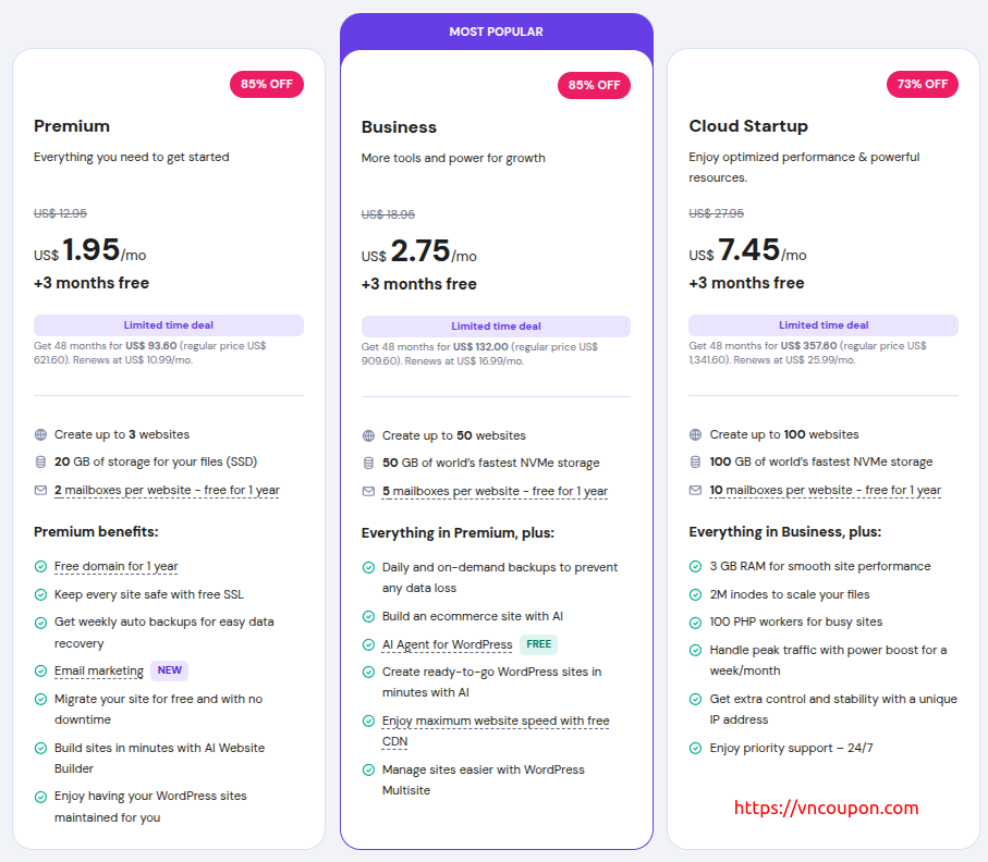 - Premium Web Hosting for $1.95/month and Business Web Hosting for $2.75/month + free domain + extra months free. Valid for 4-year subscriptions. => Promo Link