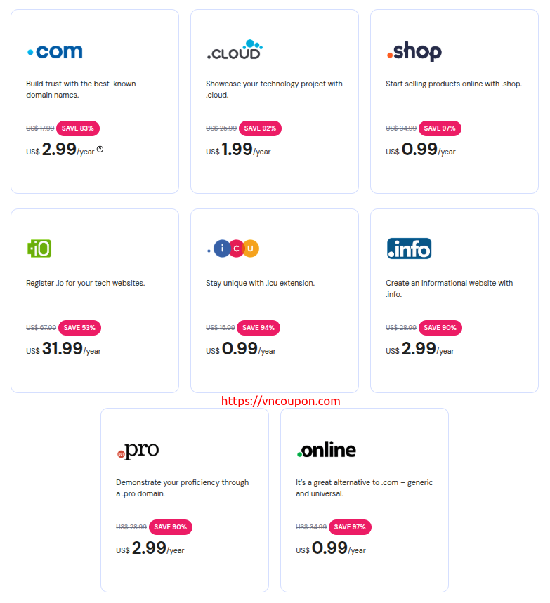 Build your online presence with unbeatable deals on popular extensions like .com, .cloud, .shop, .info, .pro, .online, .icu, and .io. Whether you’re launching a business, tech project, or personal brand, these limited-time offers give you the perfect domain at the best price — starting from just $0.99/year.