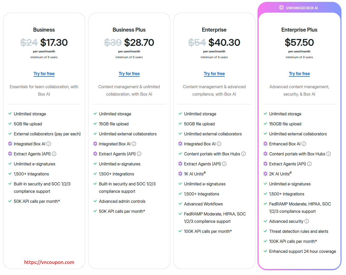 - Enterprise Plus – $57.50/user/month (annual, min 3 users) | Unlimited storage | 150GB upload | Unlimited external collaborators | Enhanced Box AI | Content portals with Box Hubs | 2K AI Units | Advanced security & threat detection | 100K API calls/month | 24h support