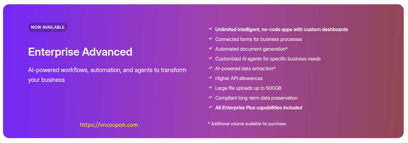 - Business Plus – $28.70/user/month (annual, min 3 users) | Unlimited storage | 15GB upload | Unlimited external collaborators | Unlimited e-signatures | Advanced admin controls | 50K API calls/month