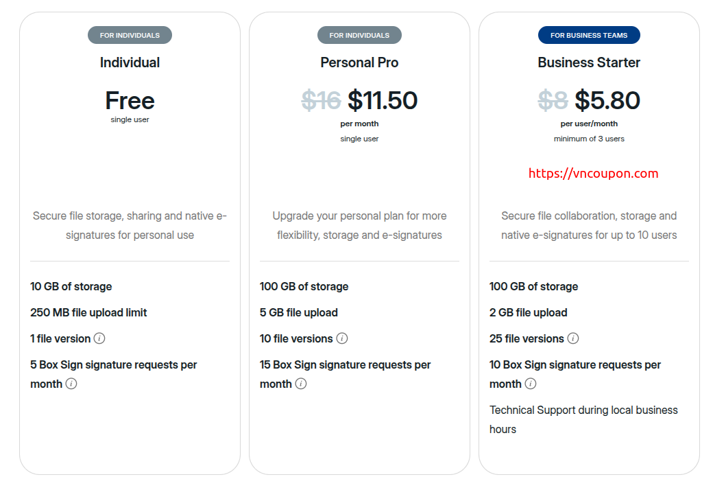 - Business Starter – $5.80/user/month (annual, min 3 users) | 100GB/user | 2GB upload | 25 versions | 10 Box Sign requests/month | Technical support