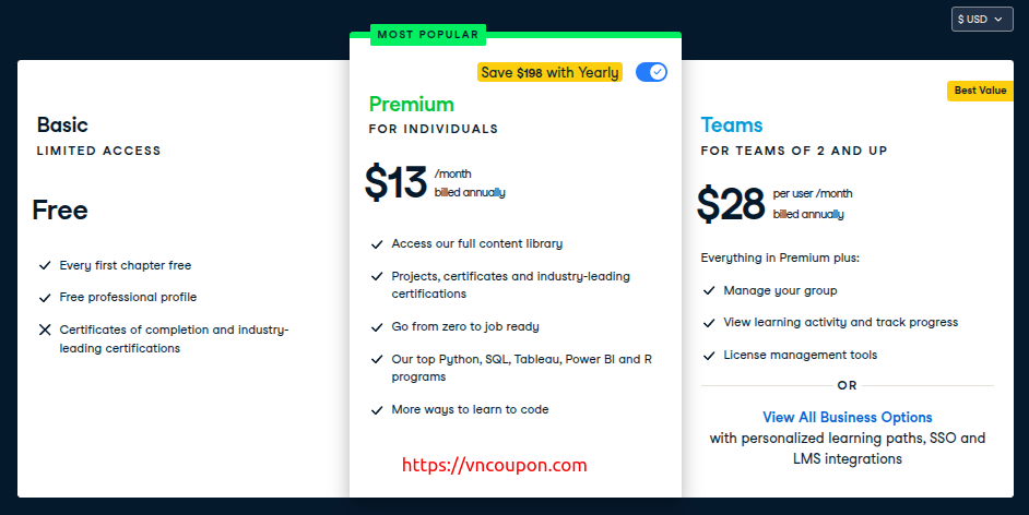 Learn the data skills you need to advance your career. Save $198 with Yearly
