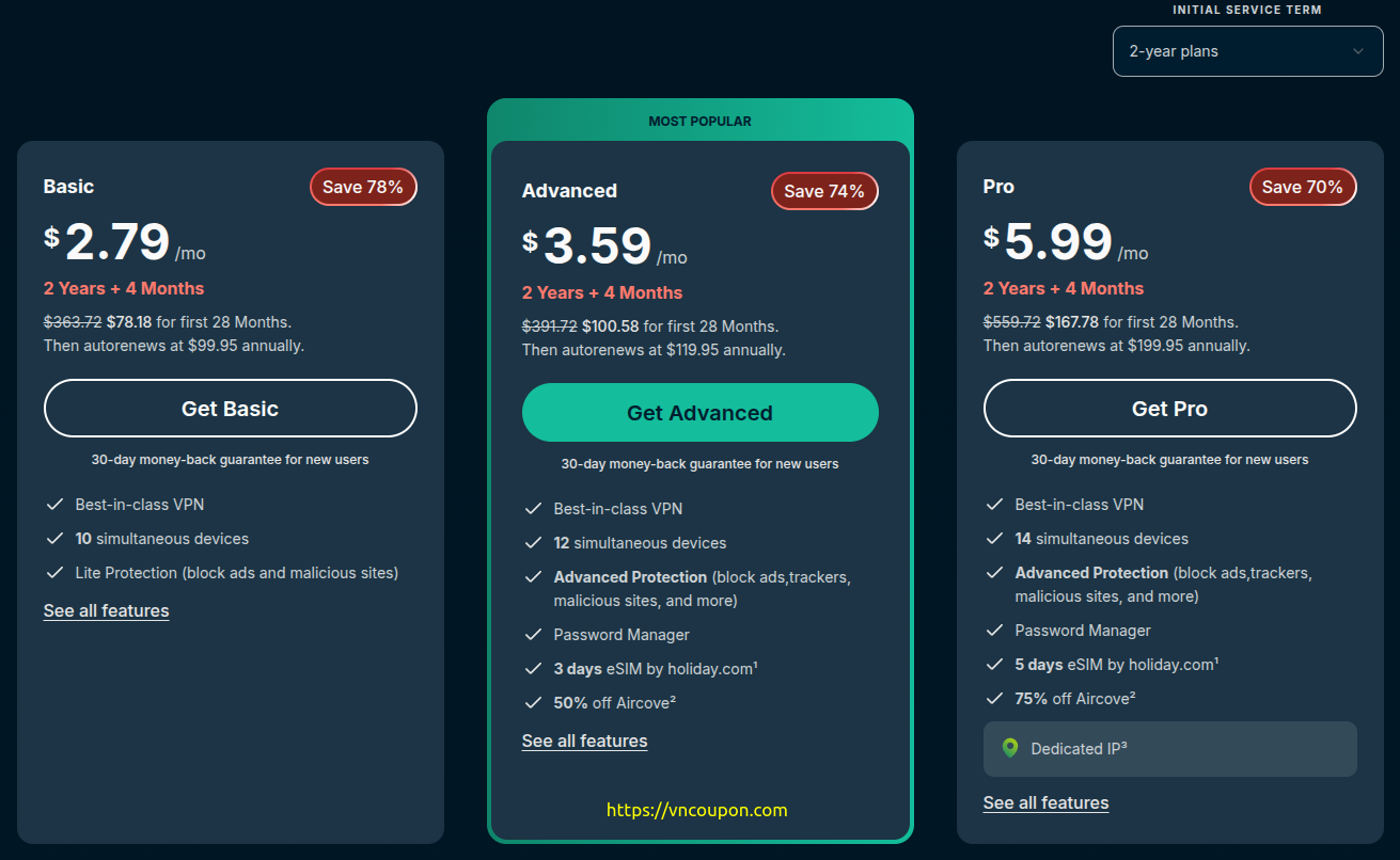 • Advanced – $3.59/month (74% off)