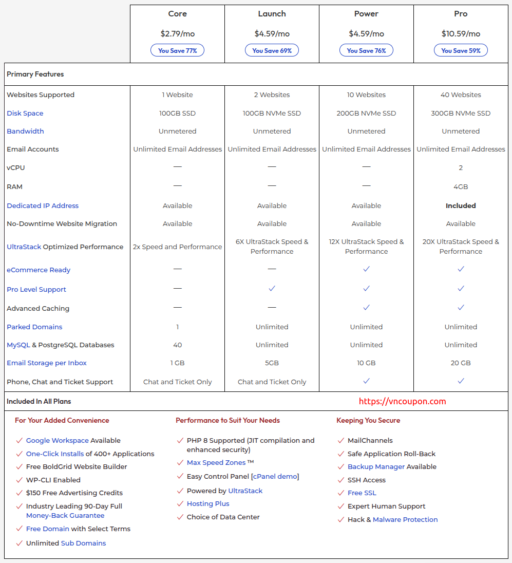 - WordPress Hosting: Optimized for WordPress with free Jetpack, automatic updates, and high-speed performance.