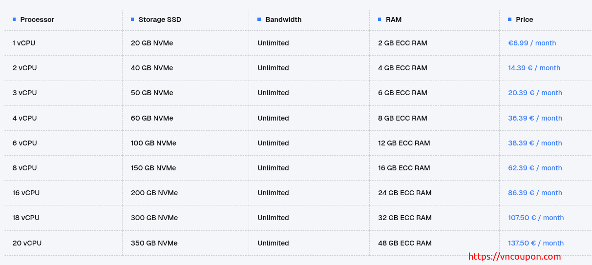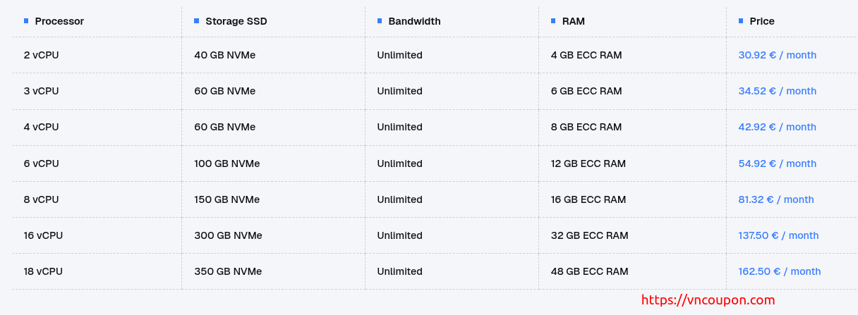 All Pro plans run on AMD EPYC processors with NVMe SSD storage. No overbooking: your allocated cores and RAM are yours to use, not shared with a crowd of neighbors. Billed monthly in EUR, cancel anytime.