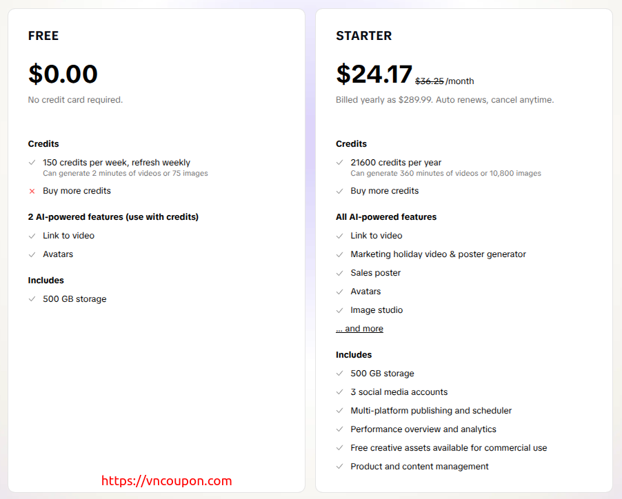 Users can start with a Free plan at $0.00, requiring no credit card, making it easy to try the platform risk-free. For more advanced features, the Starter plan is available at $24.17/month (billed yearly at $289.99), reflecting a 20% discount compared to the standard monthly price.