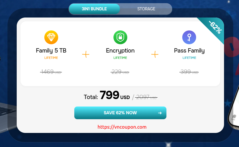 - 3in1 Family Lifetime Bundle (5TB + pCloud Encryption + pCloud Pass Family) – $799 (62% OFF)